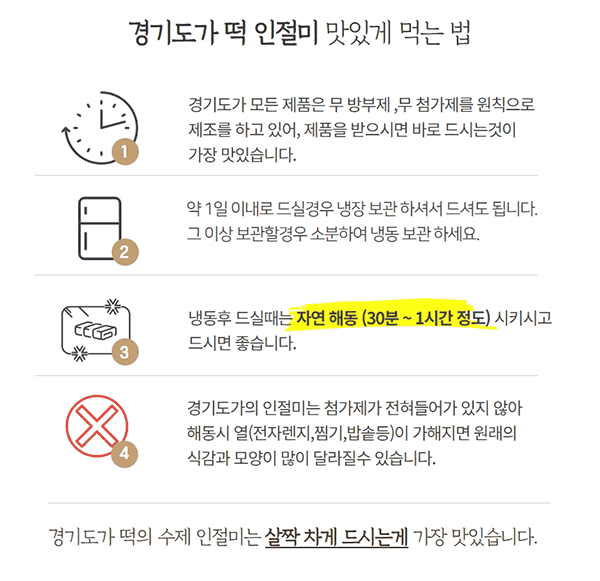 다른 냉동떡은 자연해동하려면 몇시간은 떠내 놓아야하는데 여기 떡은 아무리 오래 얼려뒀어도 실온에 30분에서 한시간 정도만 꺼내두면 다시 말랑말랑해져서 너무 신기해요~ 처음 먹었을때랑 똑같이 말랑거리고 살짝 언 상태로 먹으면 딱딱한게 아니라 더 쫀득해요~ 두텁떡